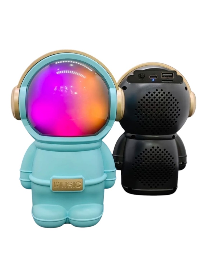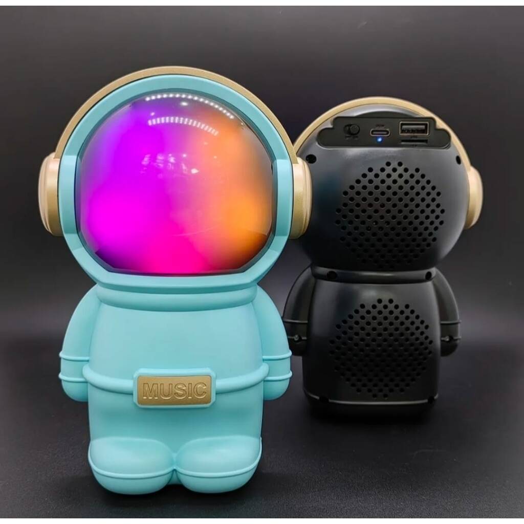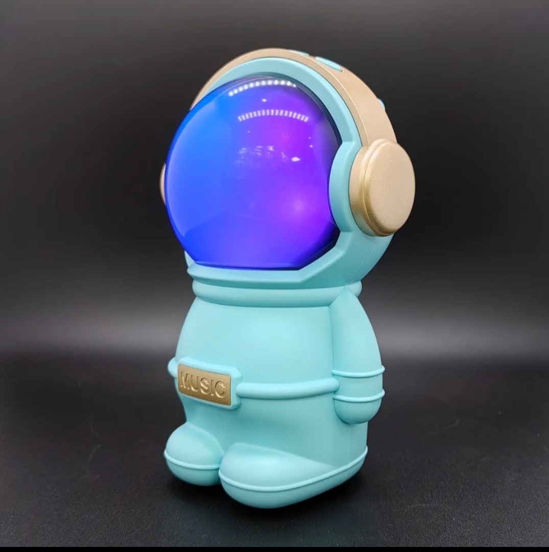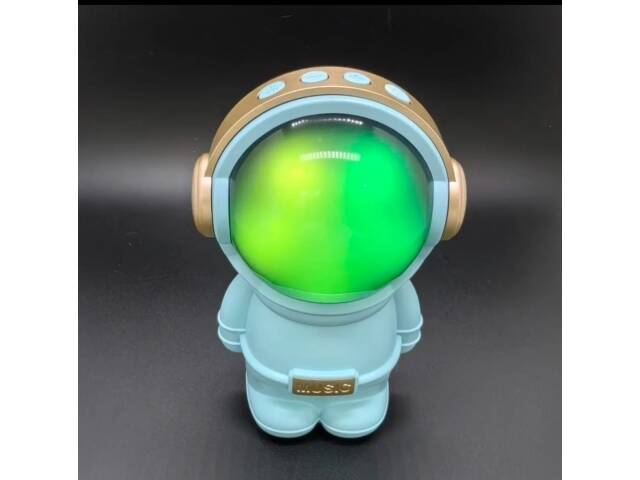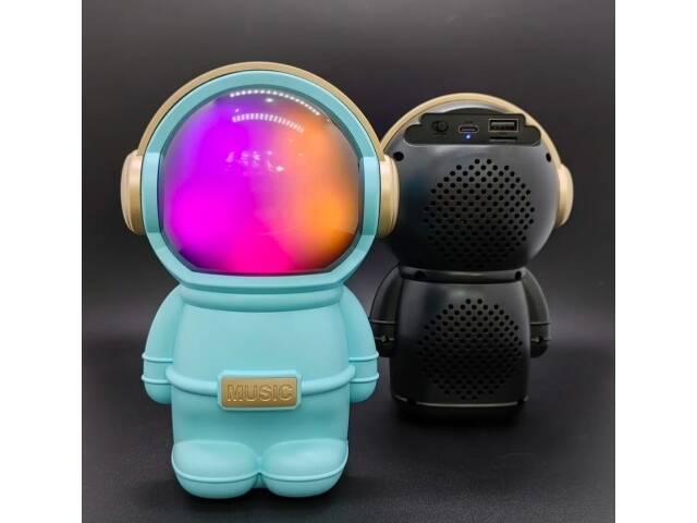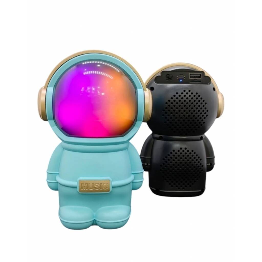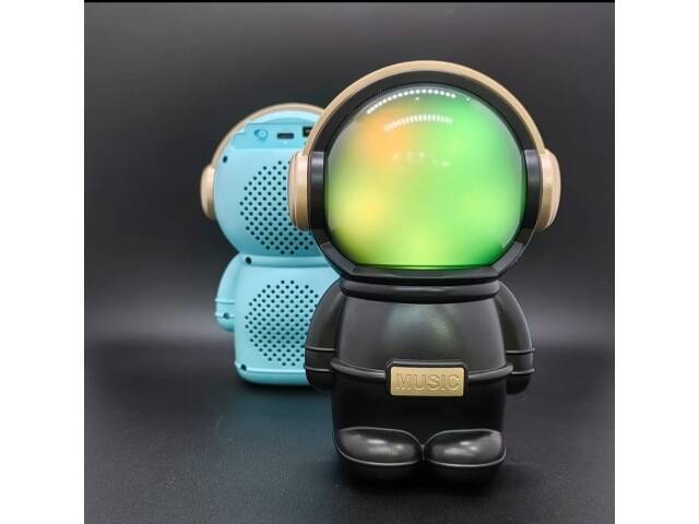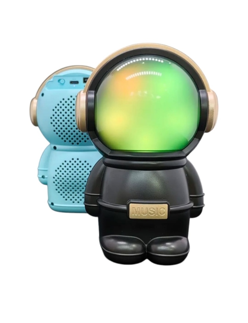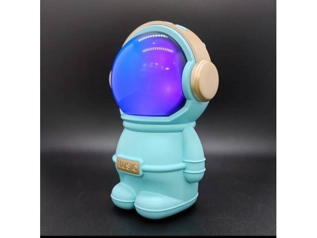 Hermoso parlante con forma de astronauta. Se conecta a tus equipos via bluetooth, tambien tiene radio fm incorporada o la posibilidad de que le agregues tu musica preferida mediante conexion usb o tarjeta de memoria micro SD. Tiene luces las cuales puedes encender, cambiar su secuencia o apagar. Muy buen sonido estéreo. Medidas 15 cm alto, 10 cm ancho, 9 cm profundidad.