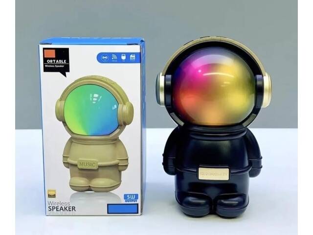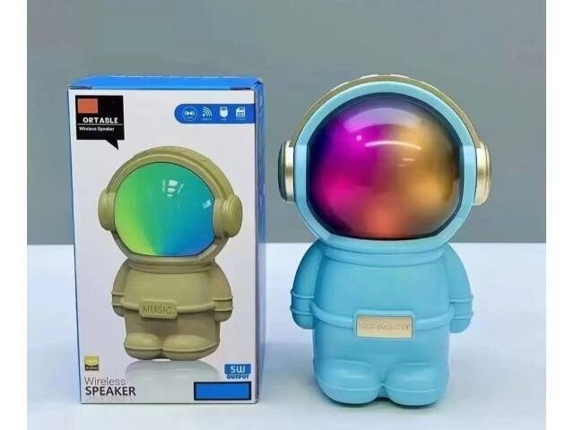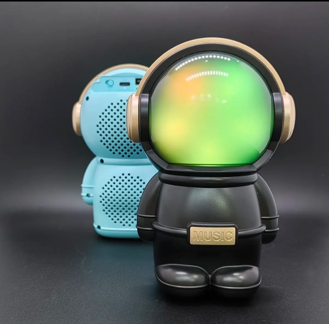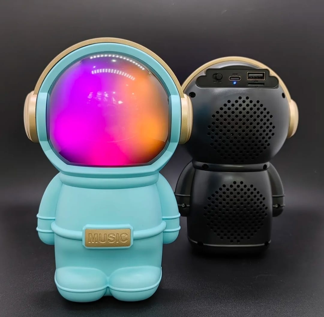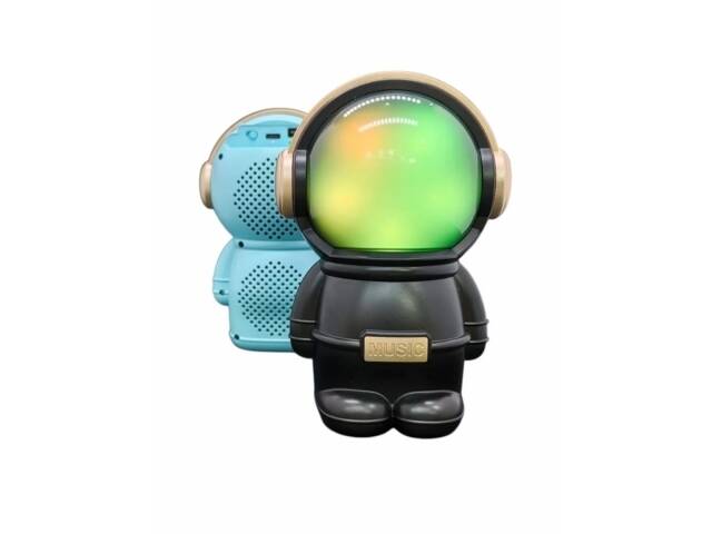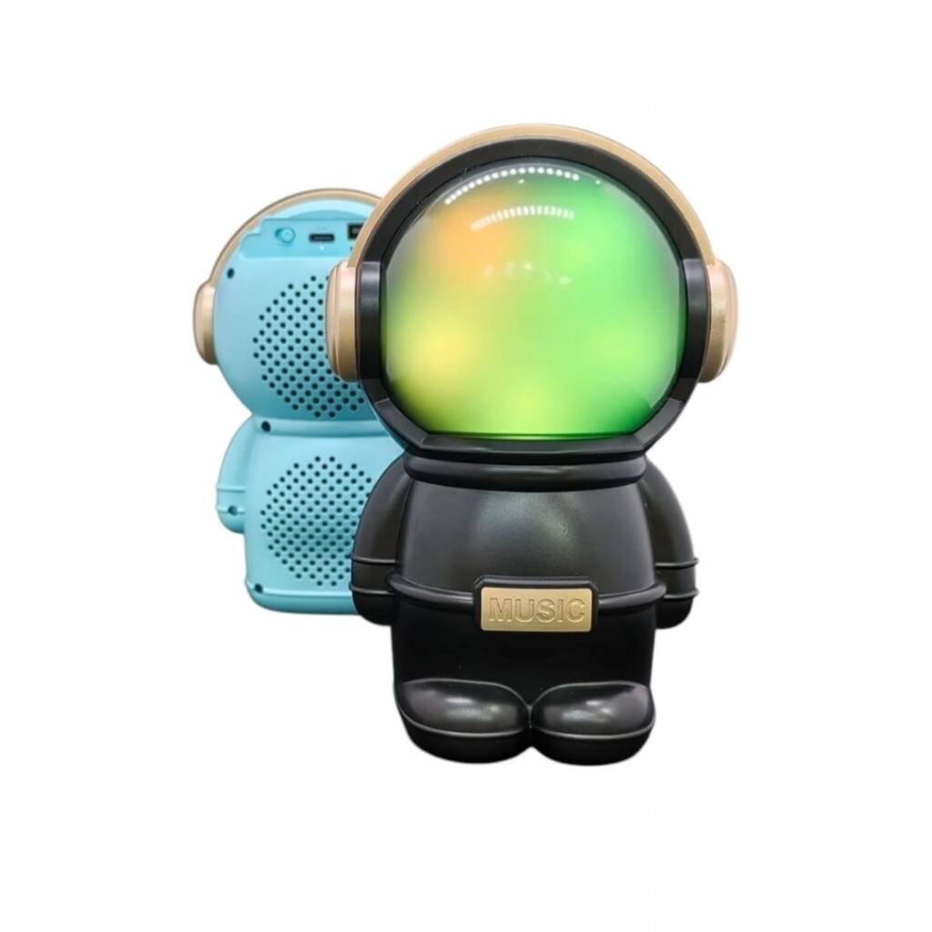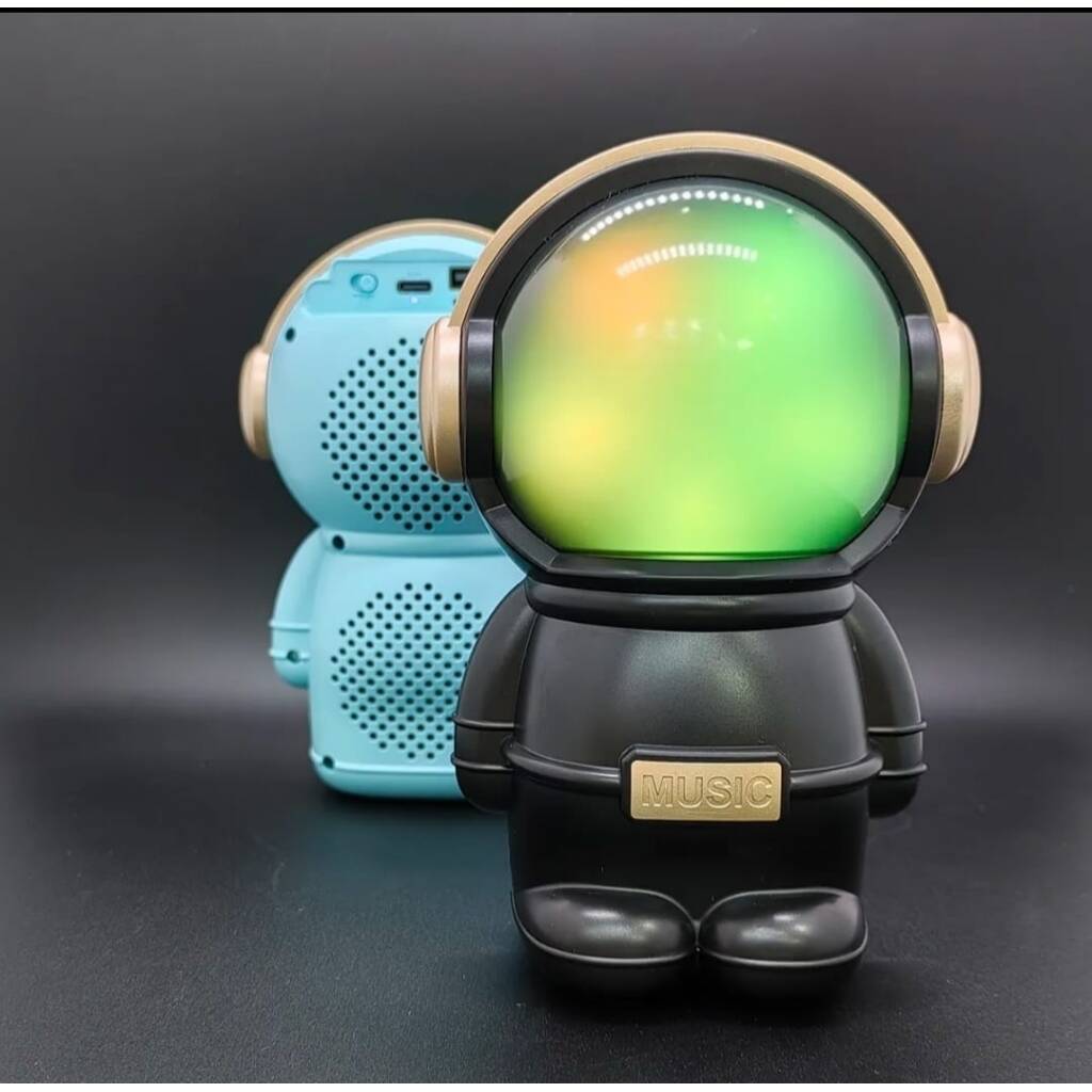 Hermoso parlante con forma de astronauta. Se conecta a tus equipos via bluetooth, tambien tiene radio fm incorporada o la posibilidad de que le agregues tu musica preferida mediante conexion usb o tarjeta de memoria micro SD. Tiene luces las cuales puedes encender, cambiar su secuencia o apagar. Muy buen sonido estéreo. Medidas 15 cm alto, 10 cm ancho, 9 cm profundidad.