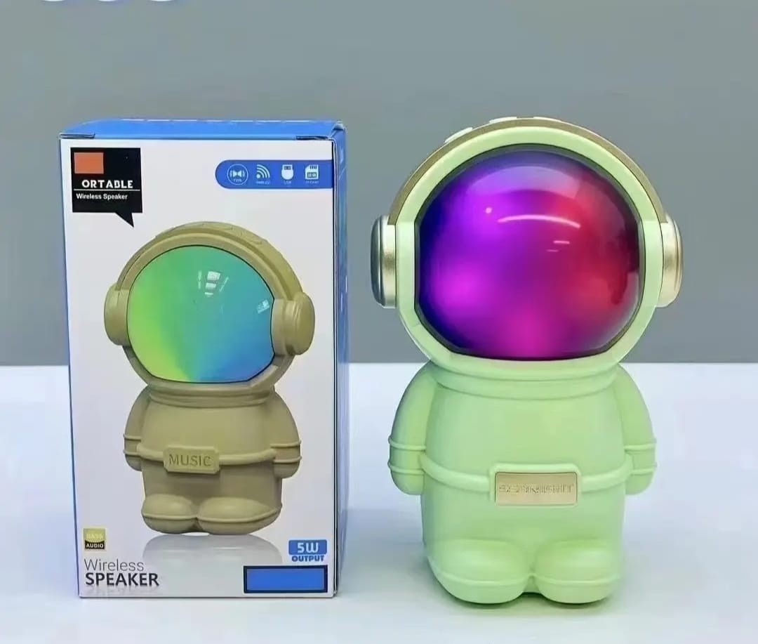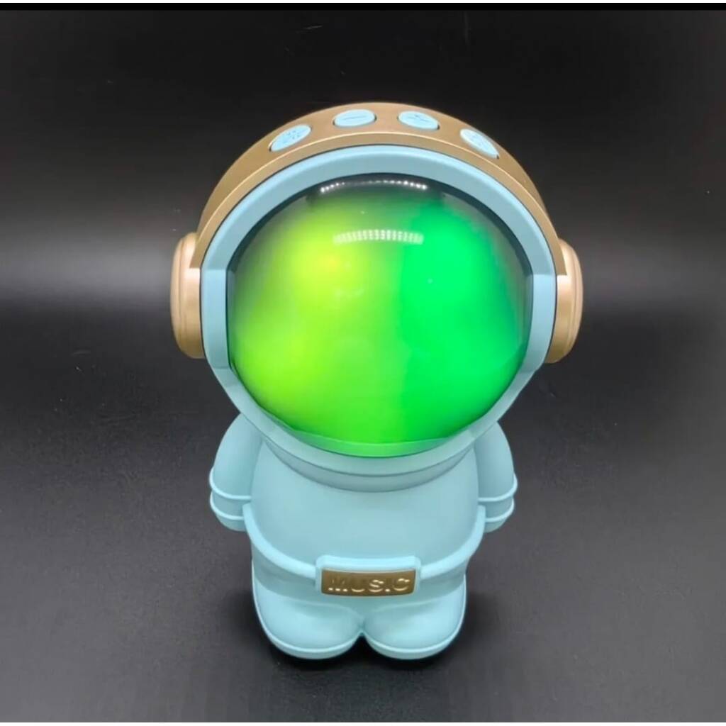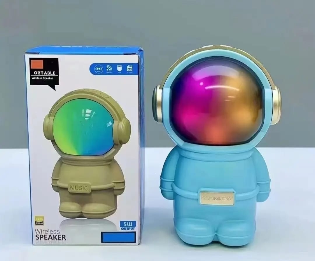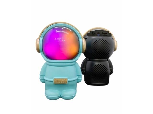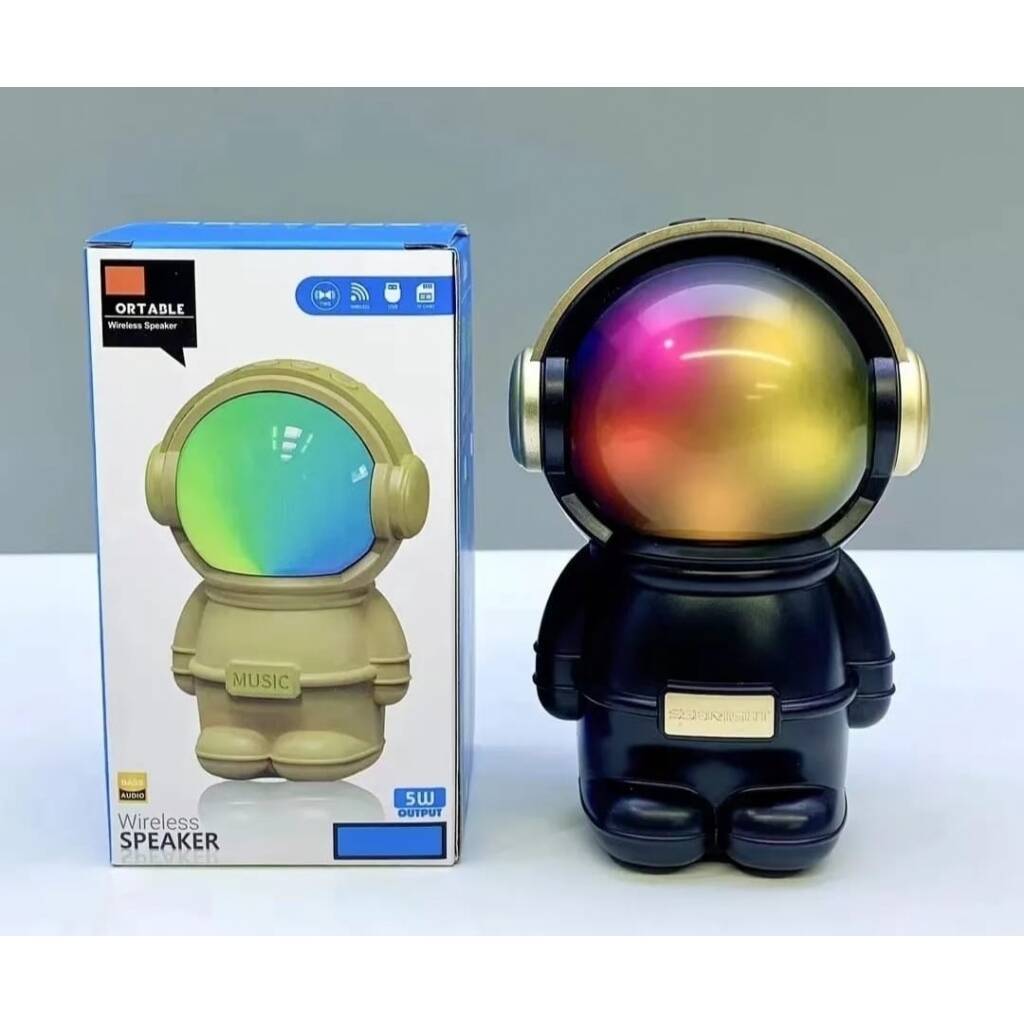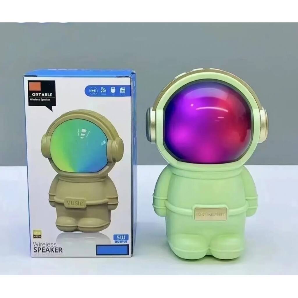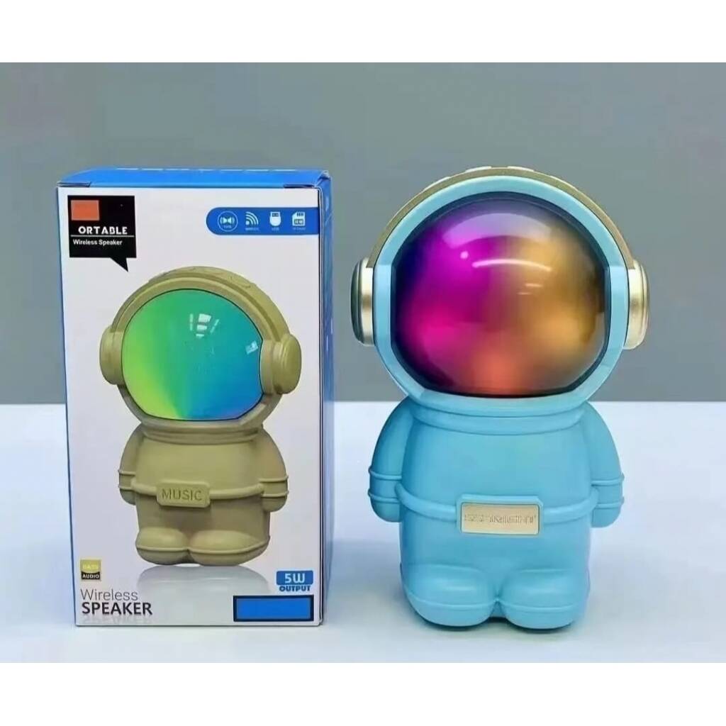 Hermoso parlante con forma de astronauta. Se conecta a tus equipos via bluetooth, tambien tiene radio fm incorporada o la posibilidad de que le agregues tu musica preferida mediante conexion usb o tarjeta de memoria micro SD. Tiene luces las cuales puedes encender, cambiar su secuencia o apagar. Muy buen sonido estéreo. Medidas 15 cm alto, 10 cm ancho, 9 cm profundidad.