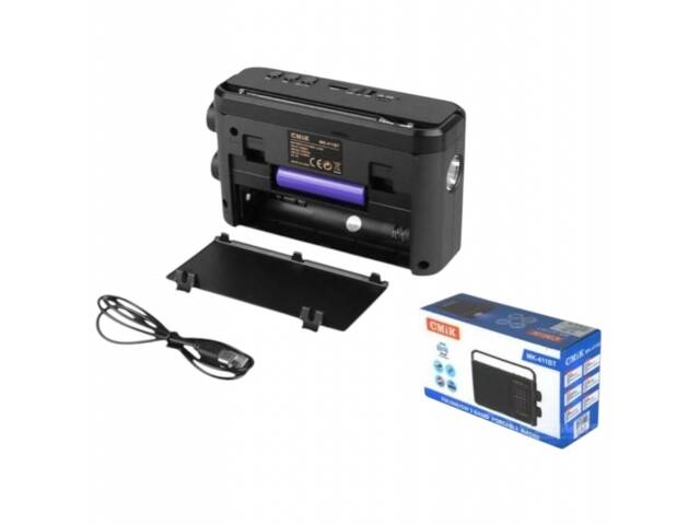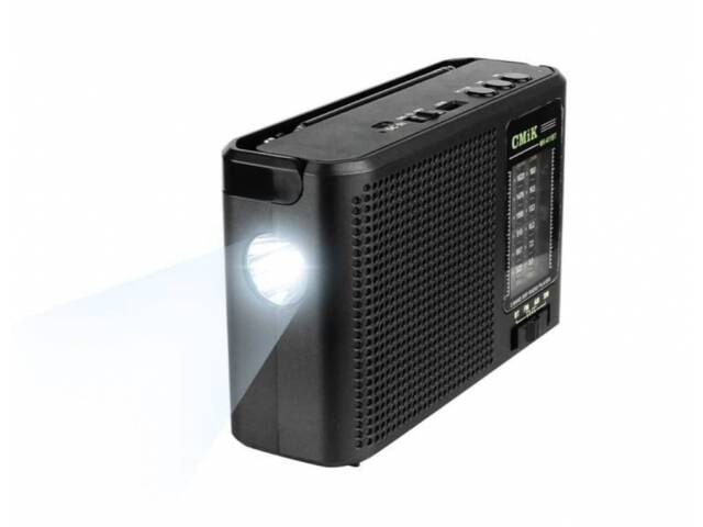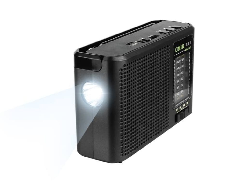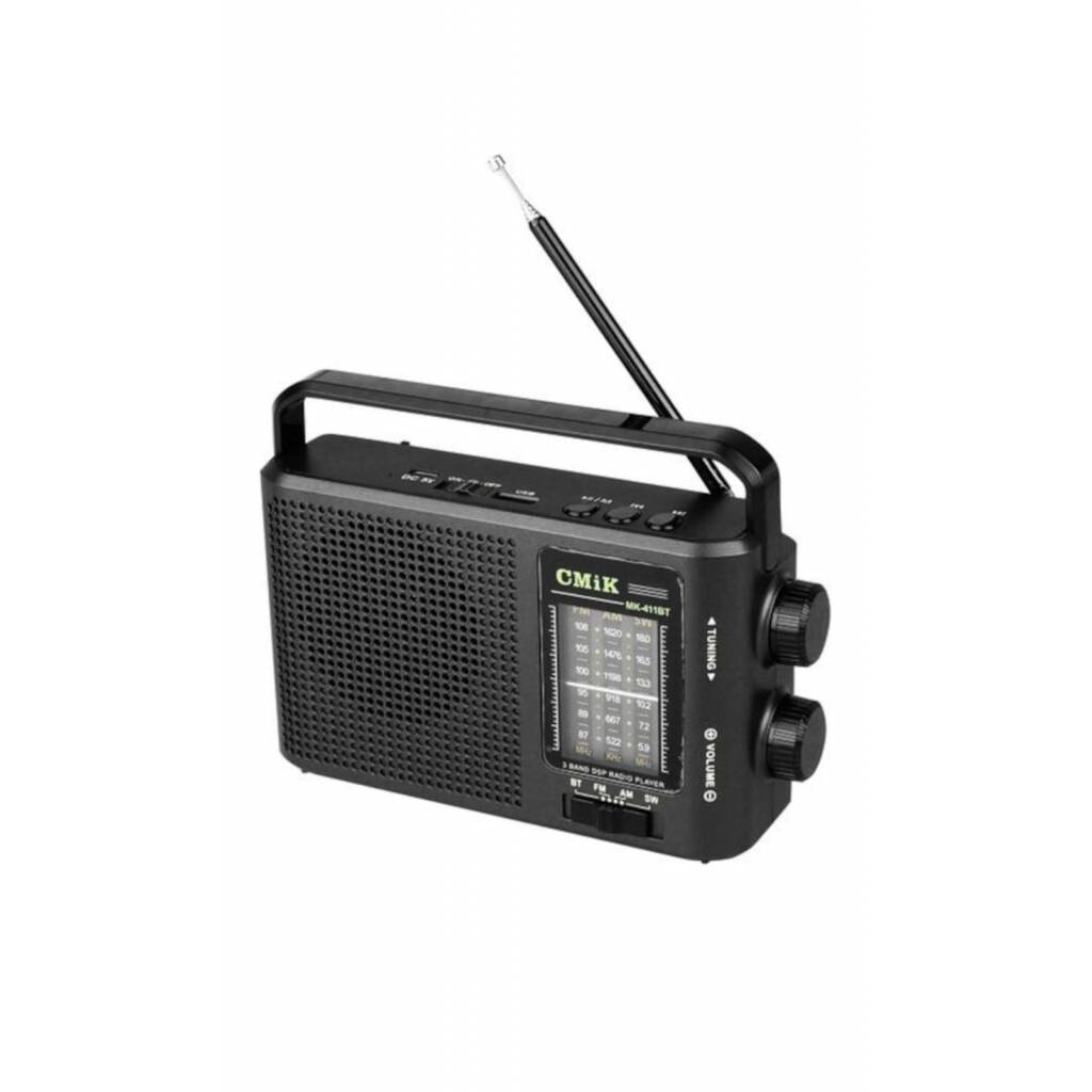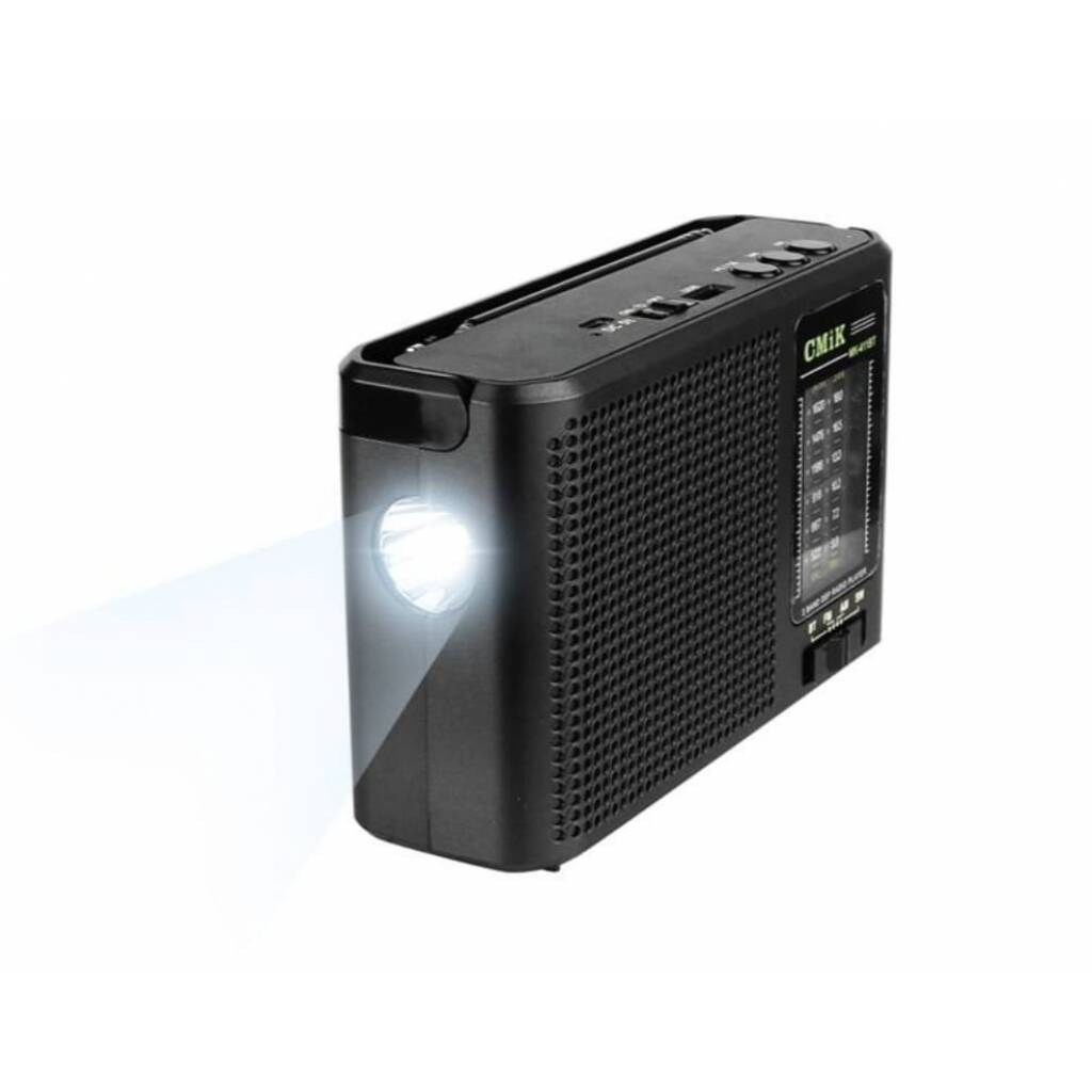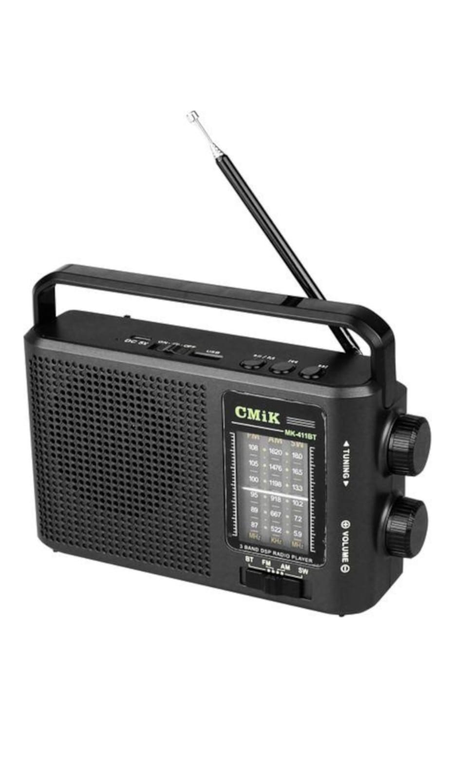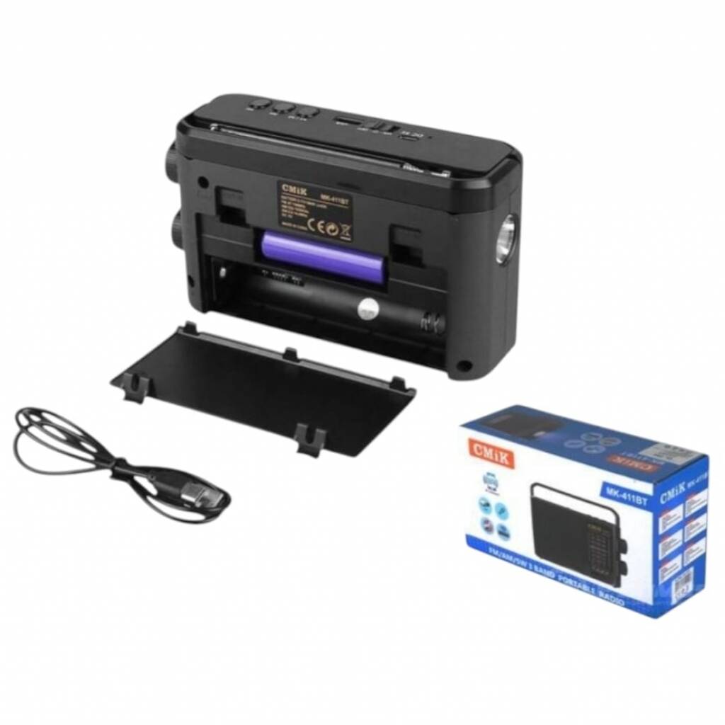 Radio CMIK MK-411BT. AM, FM, SW, Bluetooth, MP3 conexion para pendrive, linterna. Con bateria recargable incorporada (se carga con usb tipo c) o a pilas tamaño D. Incluye cable de carga. Tamaño 18 cm ancho, 10 cm alto, 5,5 cm profundidad.