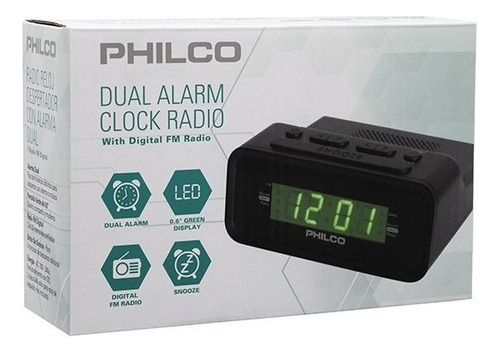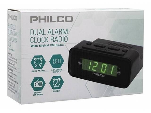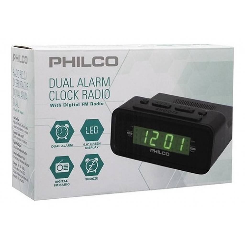 Radio reloj Philco 1006 gr. Alarma dual. Fija dos horarios para despertar tanto con alarma como con radio. Números verdes bien visibles. Radio fm con 20 memorias prefijadas. Botón snooze para 9 minutos extra de descanso. Funciona a corriente. Autovoltaje desde 100v hasta 240v. 2 pilas aaa solo para respaldo de la hora ante cortes de electricidad. No funciona a pila. Garantía 6 meses.
