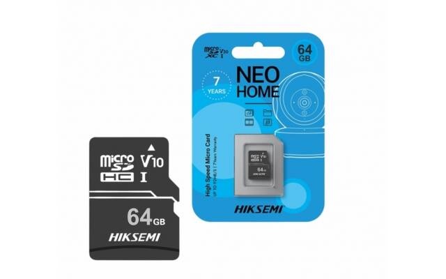 Memoria MicroSD Hiksemi Modelo: Neo Home Serie: Micro SD HC 64GB de capacidad. Velocidad de lectura de hasta 92 MB/S Ideal para camaras de seguridad Compatible con cualquier dispositivo que utilice Micro SD.