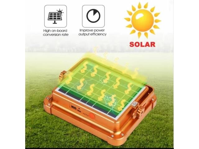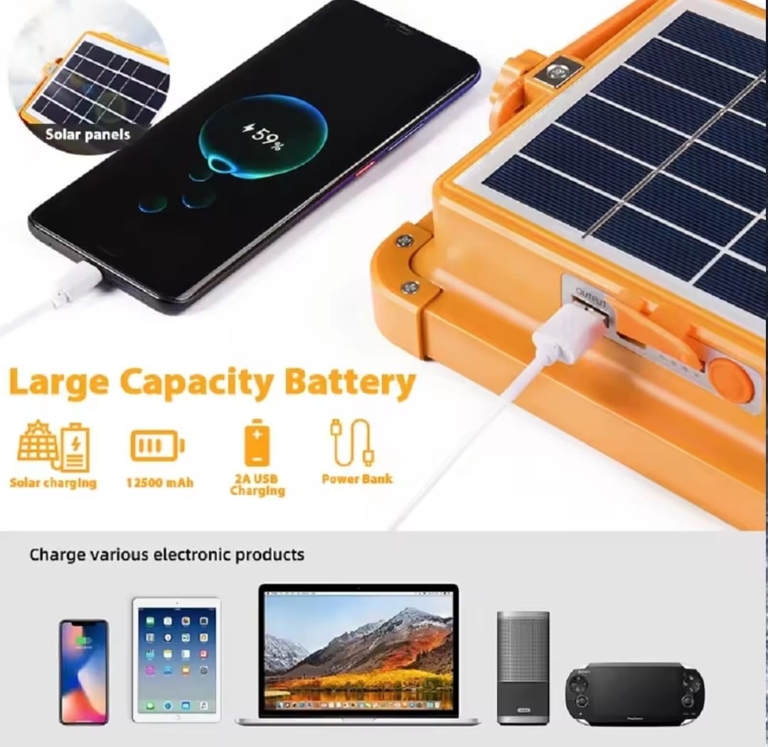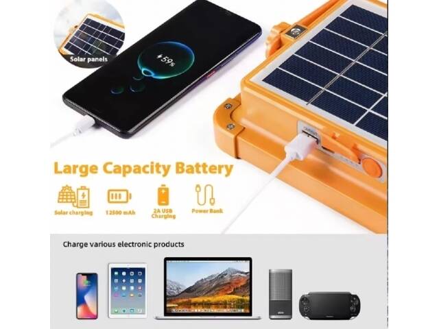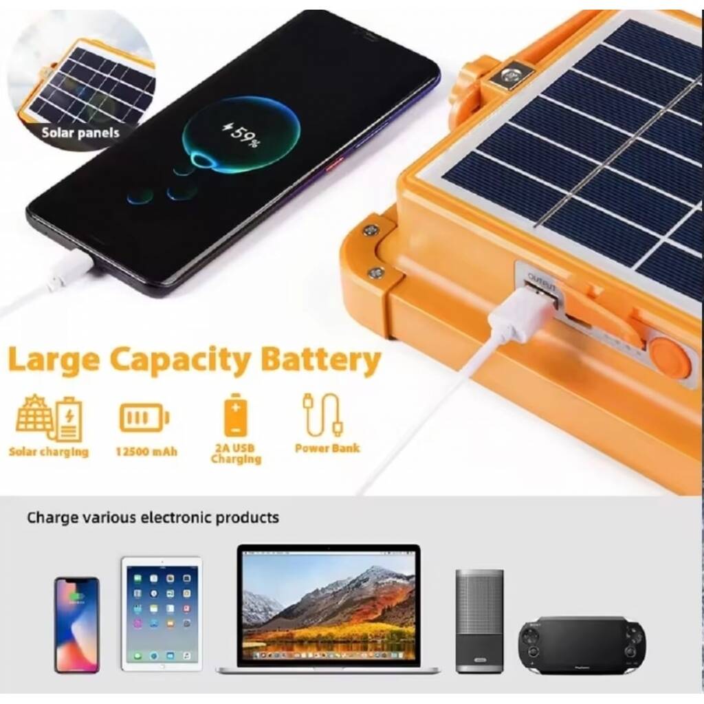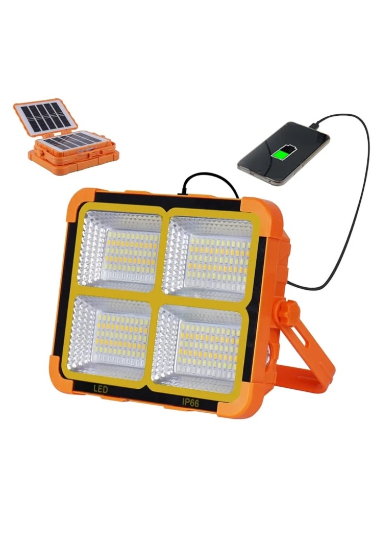 Foco led con panel solar. Luz led fria, cálida, y azul y roja que alternan simil a una sirena. Tambien puede recargar cualquier articulo con conexion USB.
