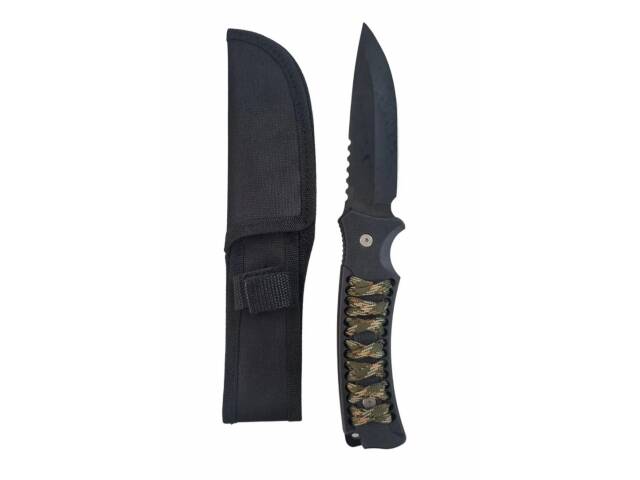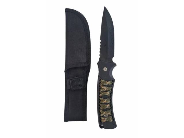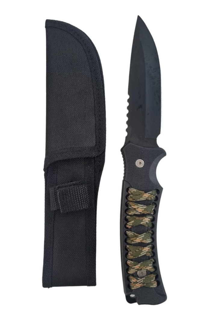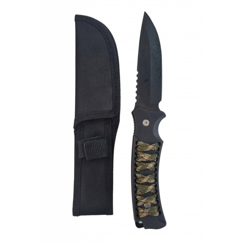 Puñal mango con cuerda. Cuchillo mango con cuerda. Hoja enteriza en color negro. Largo total 26 cm. Largo de hoja 13 cm. Incluye funda de tela para la cintura.