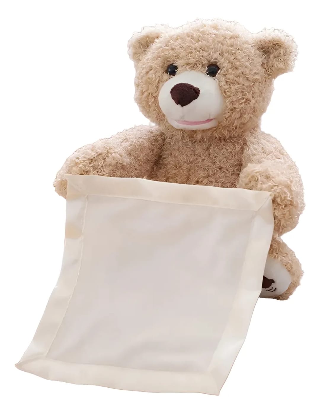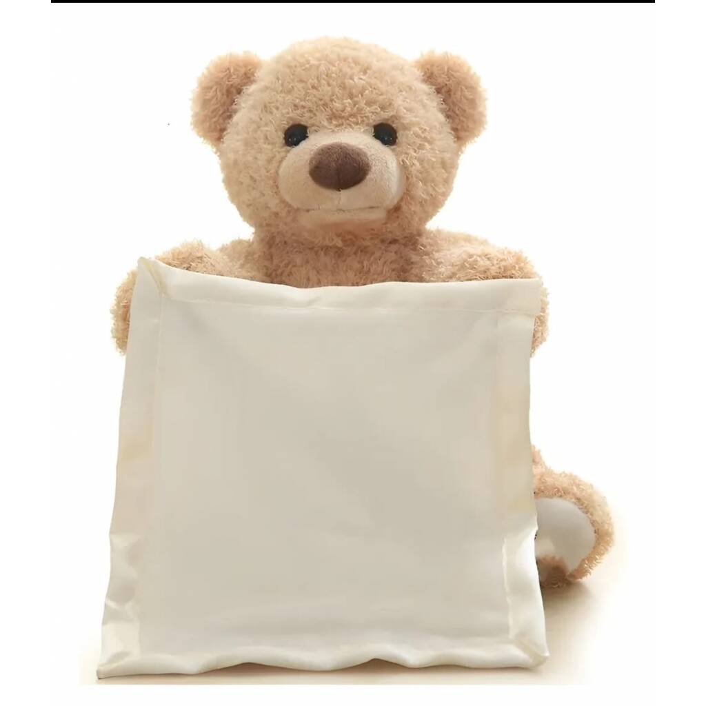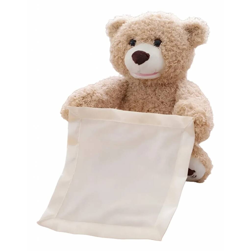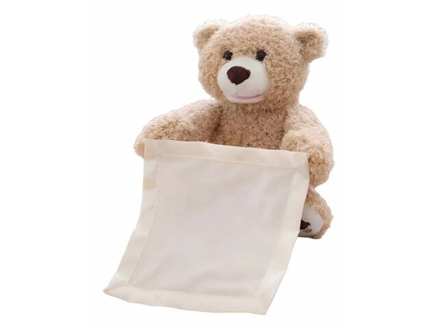 Encantador osito de peluche con movimiento y sonido. Éste osito se esconde detrás de la toallita. El clásico juego que realizamos con los bebés. ¡¡ No está, no está, acá está!!