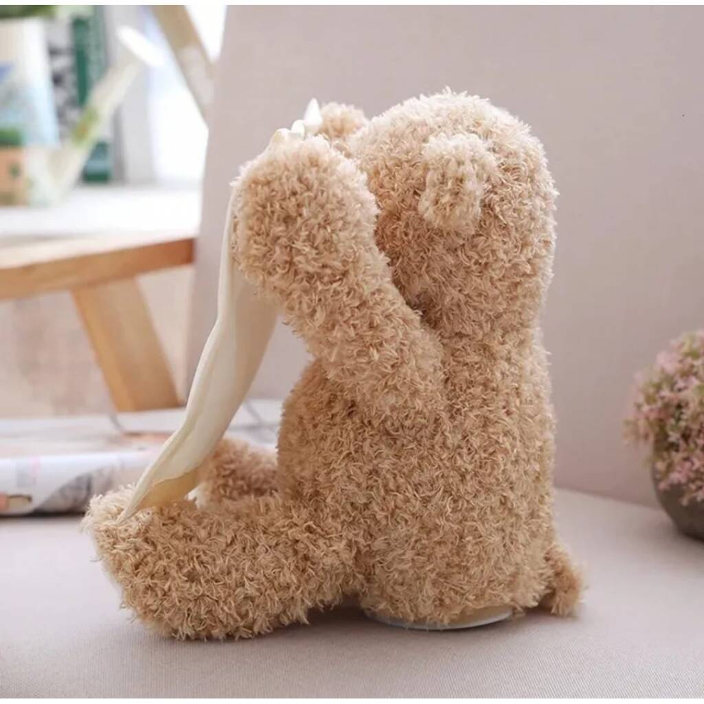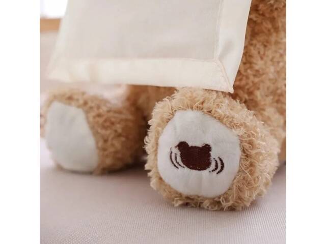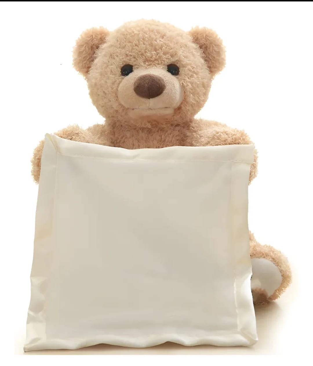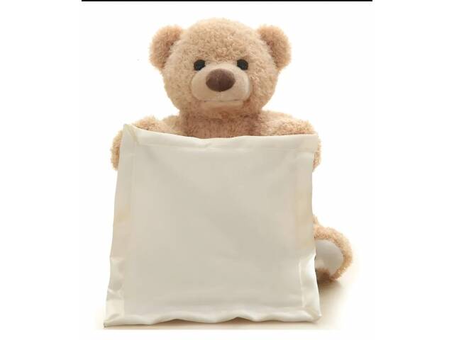 Encantador osito de peluche con movimiento y sonido. Éste osito se esconde detrás de la toallita. El clásico juego que realizamos con los bebés. ¡¡ No está, no está, acá está!!