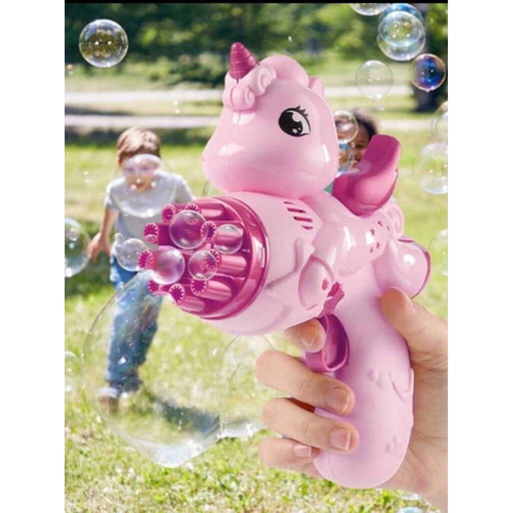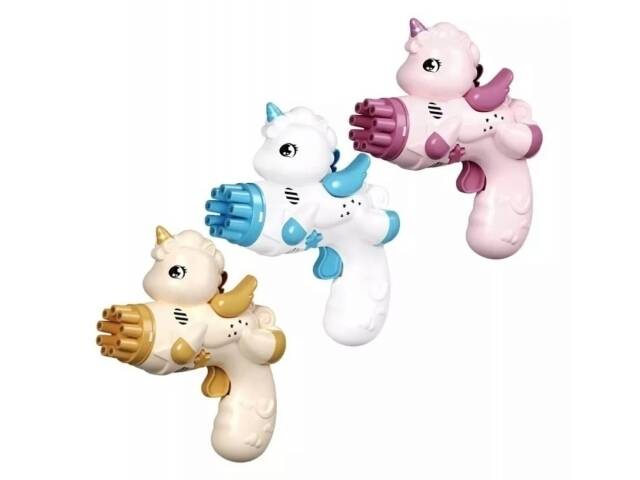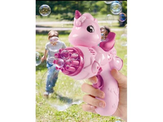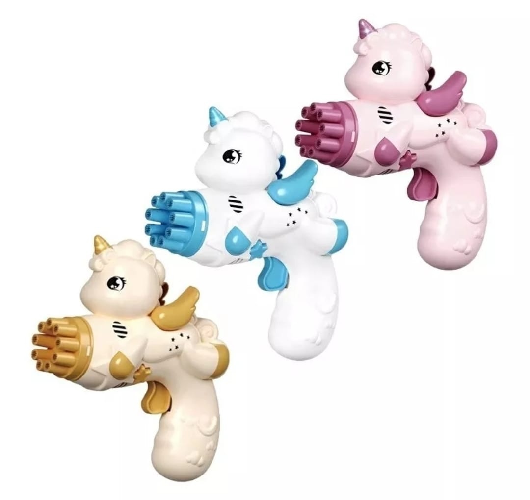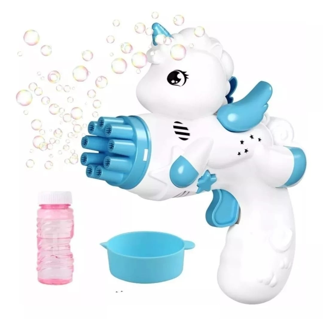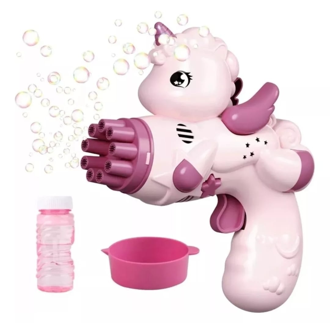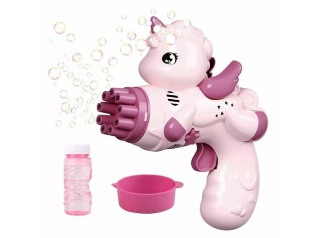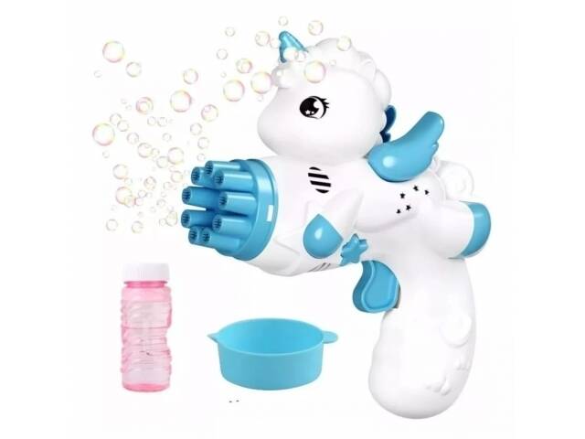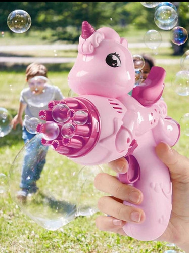 Pistola de burbujas unicornio. Funciona a pila con 2 aa no incluidas. Moja las 8 bocas de salida de aire en el jabón y al apretar el botón genera burbujas. Es de uso muy sencillo. Disfrute de horas de diversión con los niños.