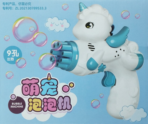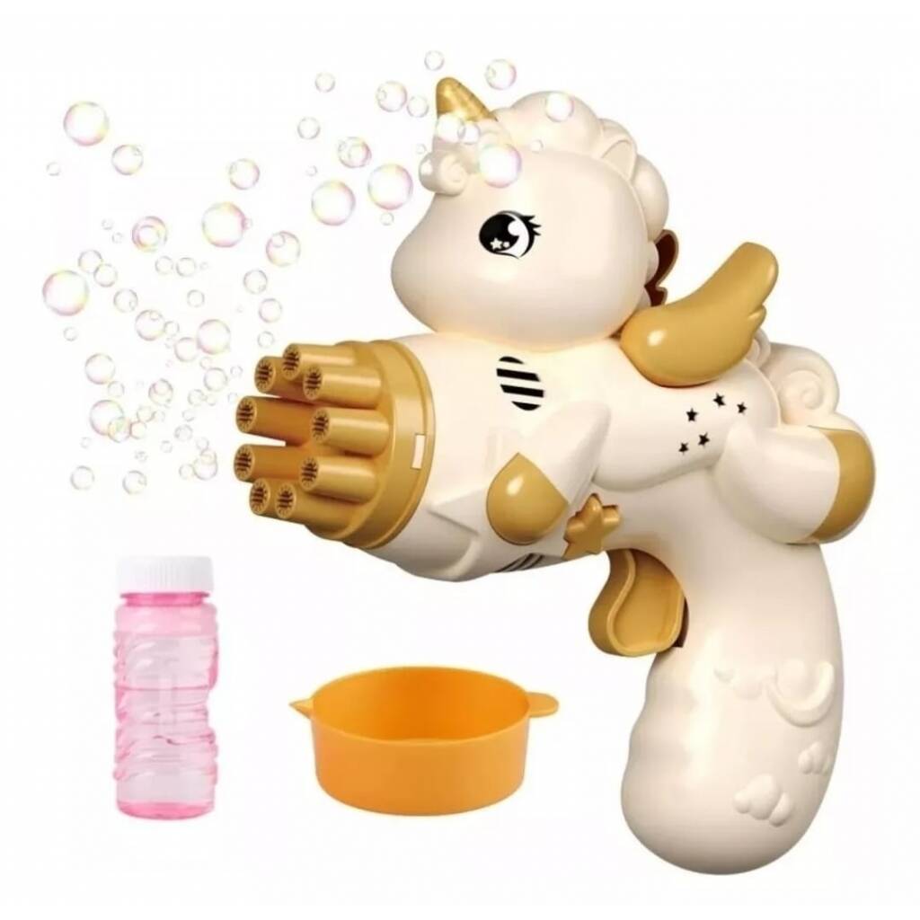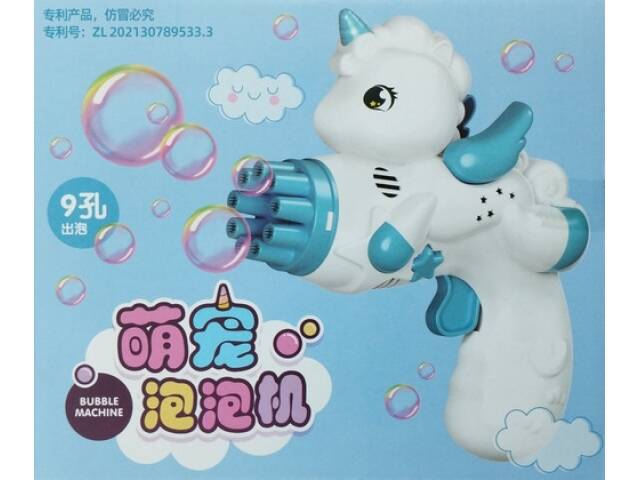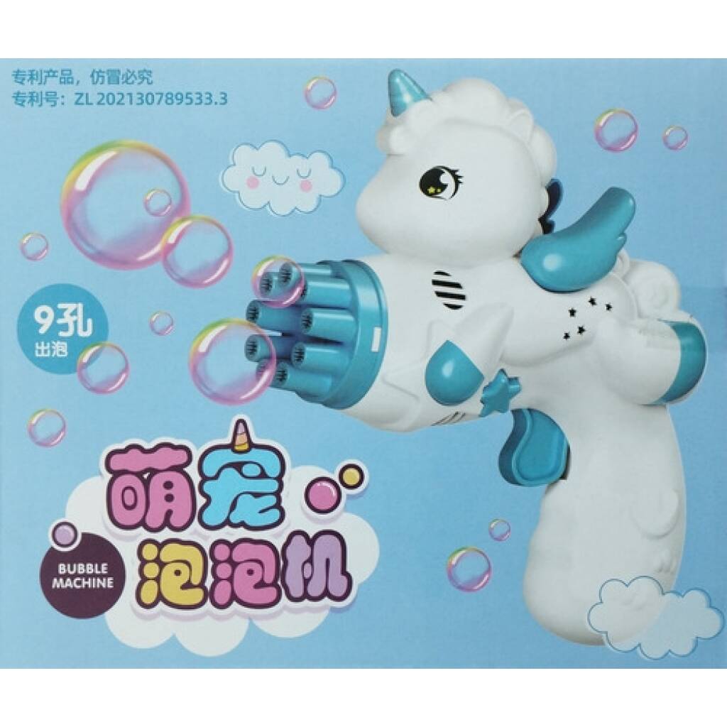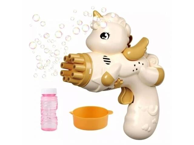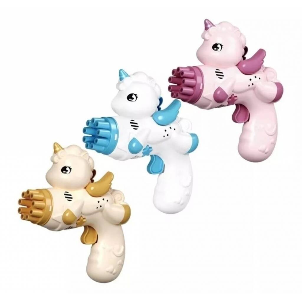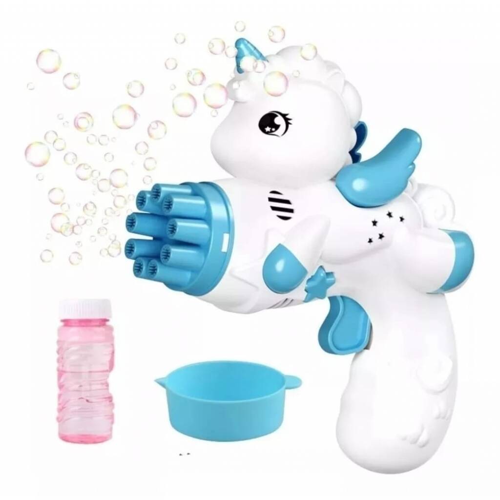 Pistola de burbujas unicornio. Funciona a pila con 2 aa no incluidas. Moja las 8 bocas de salida de aire en el jabón y al apretar el botón genera burbujas. Es de uso muy sencillo. Disfrute de horas de diversión con los niños.
