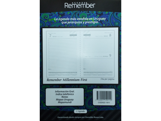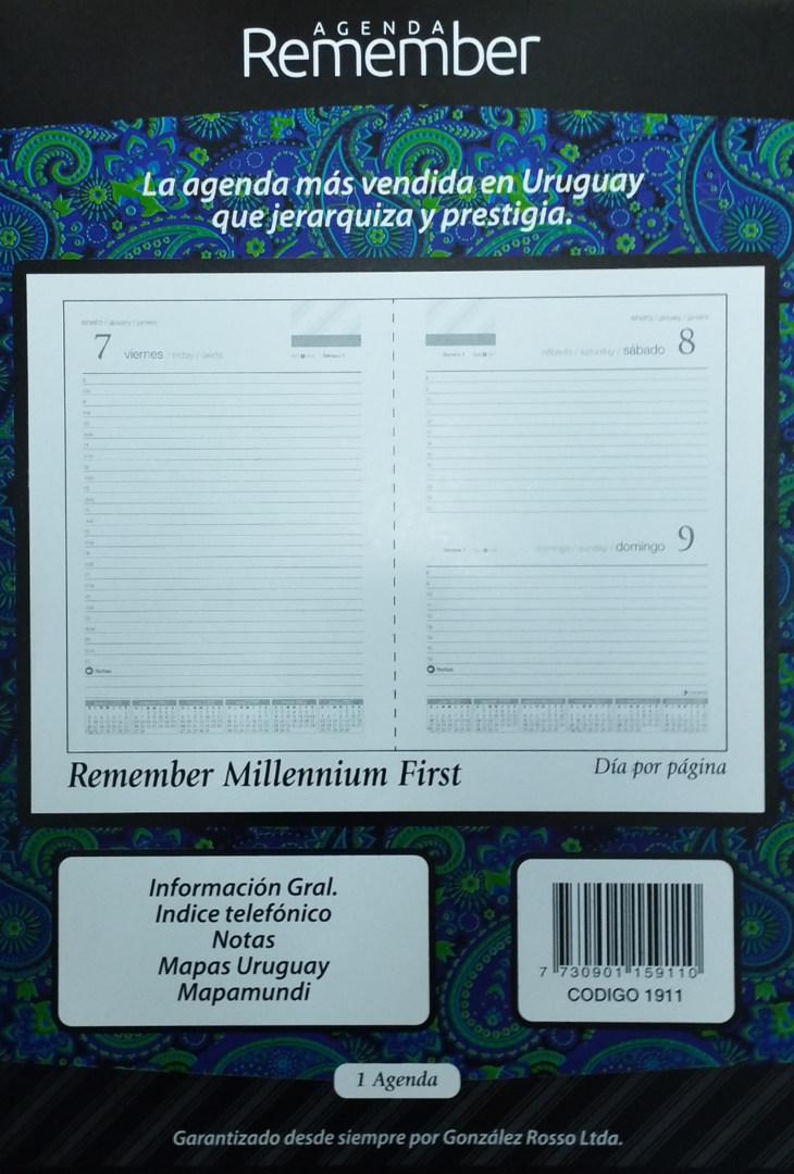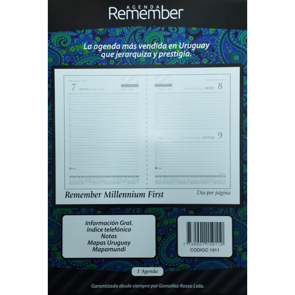 Agenda Remember Millennium First año 2026. Día por página. Medidas 17 cm x 23 cm. Colores clásicos, Marrón, Verde, Azul, Negro, Bordeaux. Consultar disponibilidad de color.