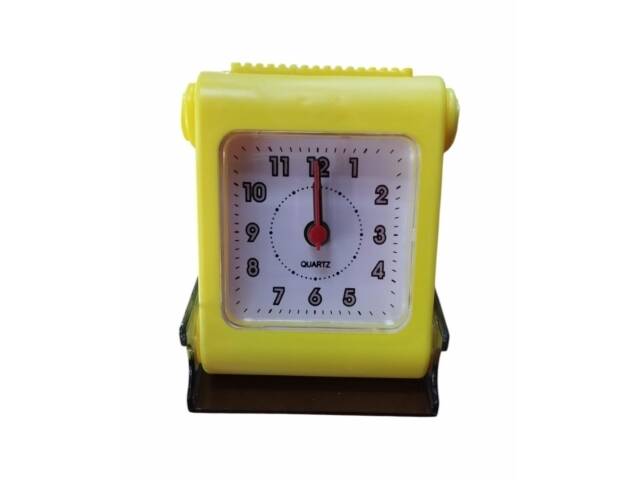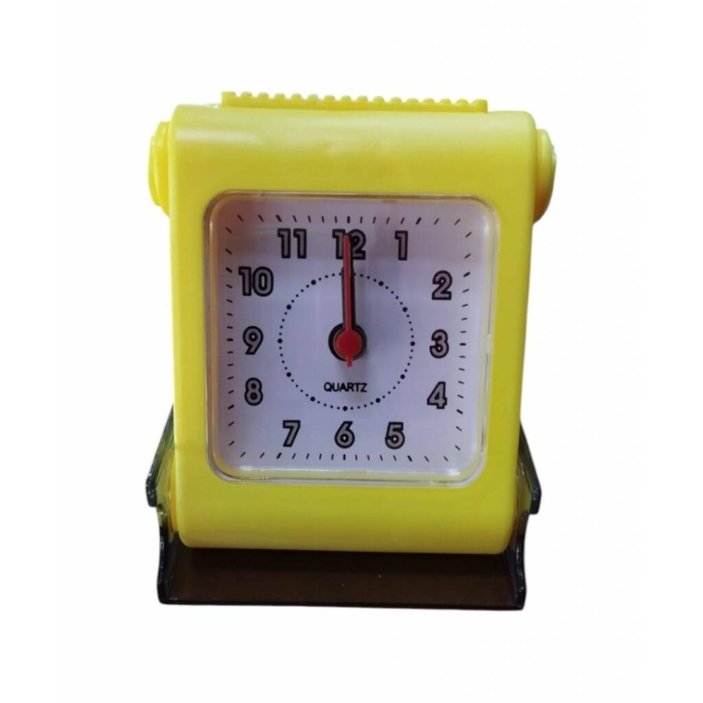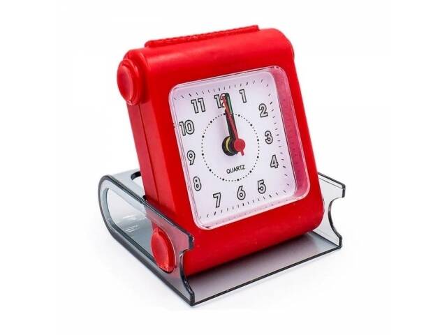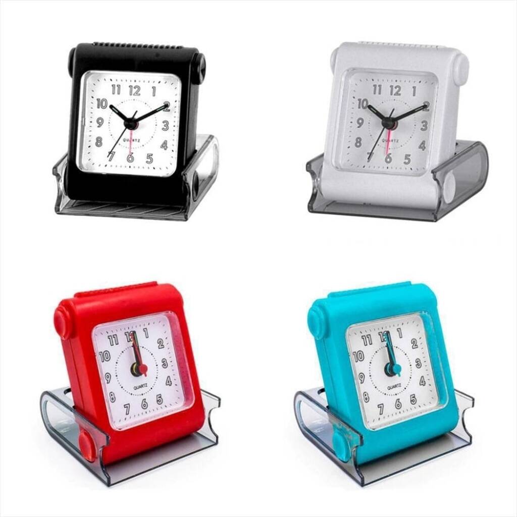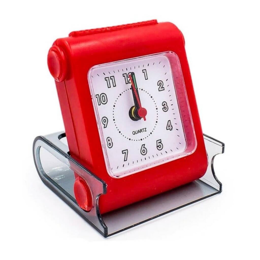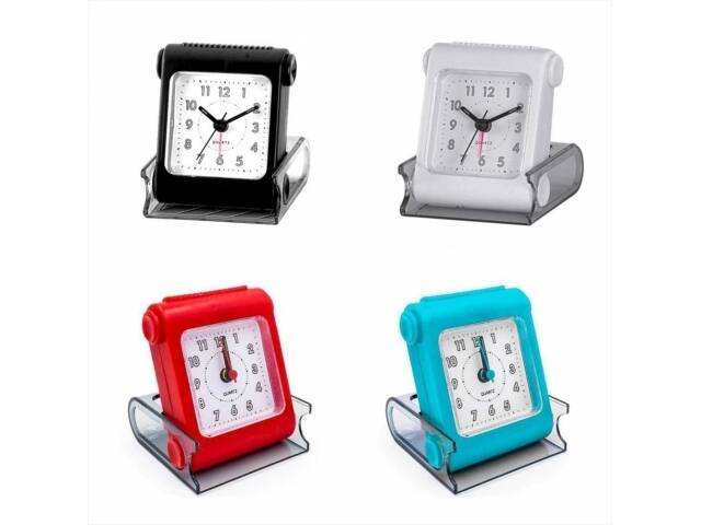 Reloj despertador a pila. La tapa que lo proteje hace de base de sustento al deslizarla. Sonido clásico beep beep beep. Tiene luz al apretar el botón superior. La alarma se apaga desde una perilla en la parte trasera. Funciona con una pila AA no incluida. Colores surtidos. Consulte disponibilidad de color.