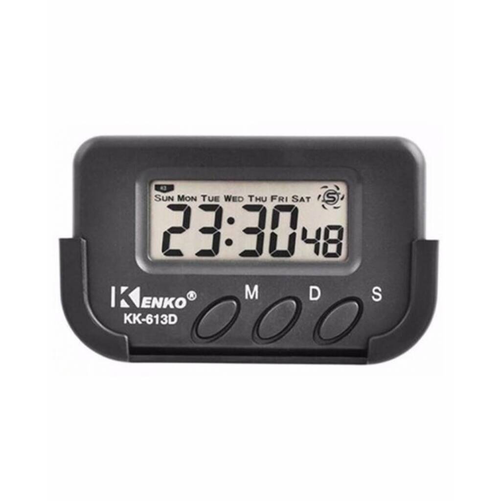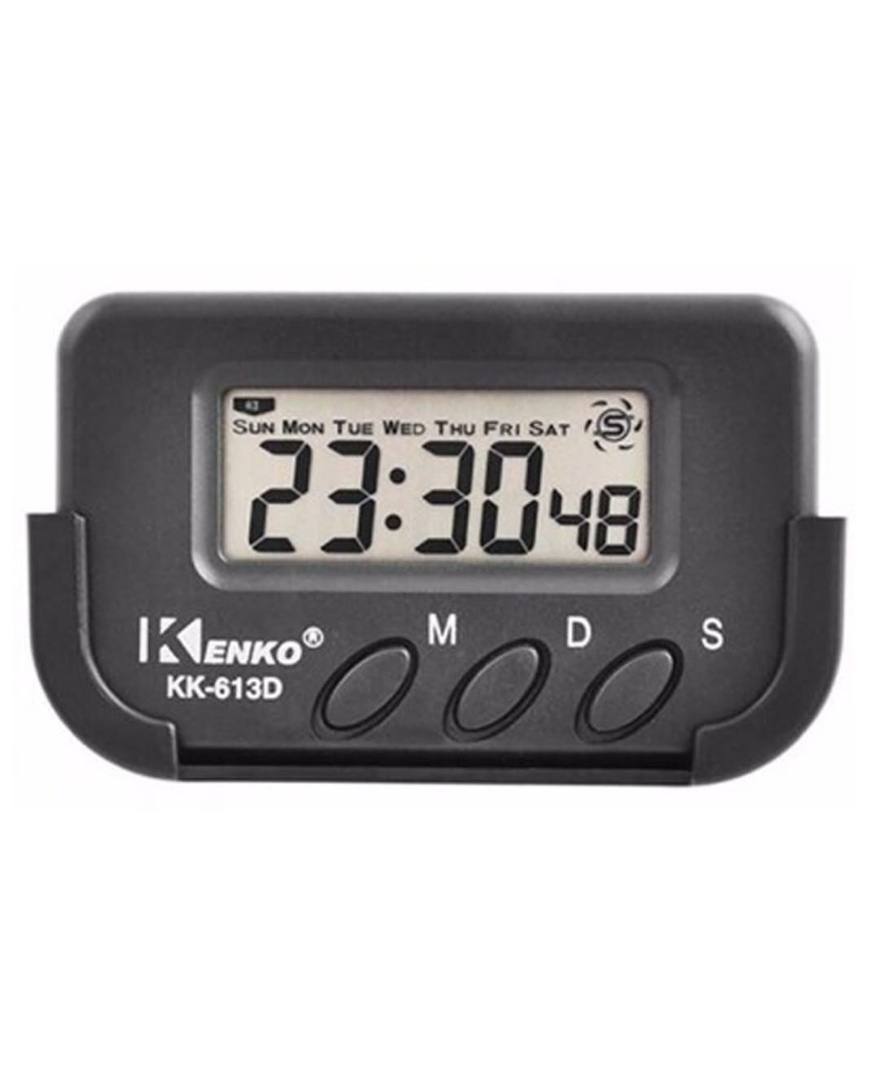 Reloj para coche. Trae un soporte adhesivo del cual se puede sacar el reloj. En pantalla se ve hora, minutos y segundos. Tiene cronómetro y alarma.