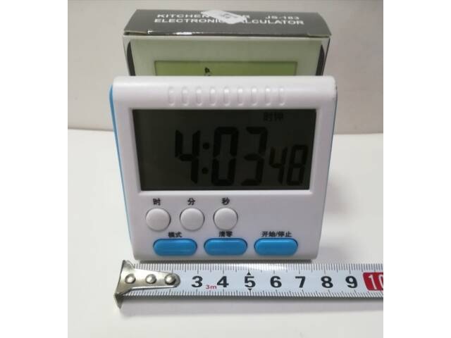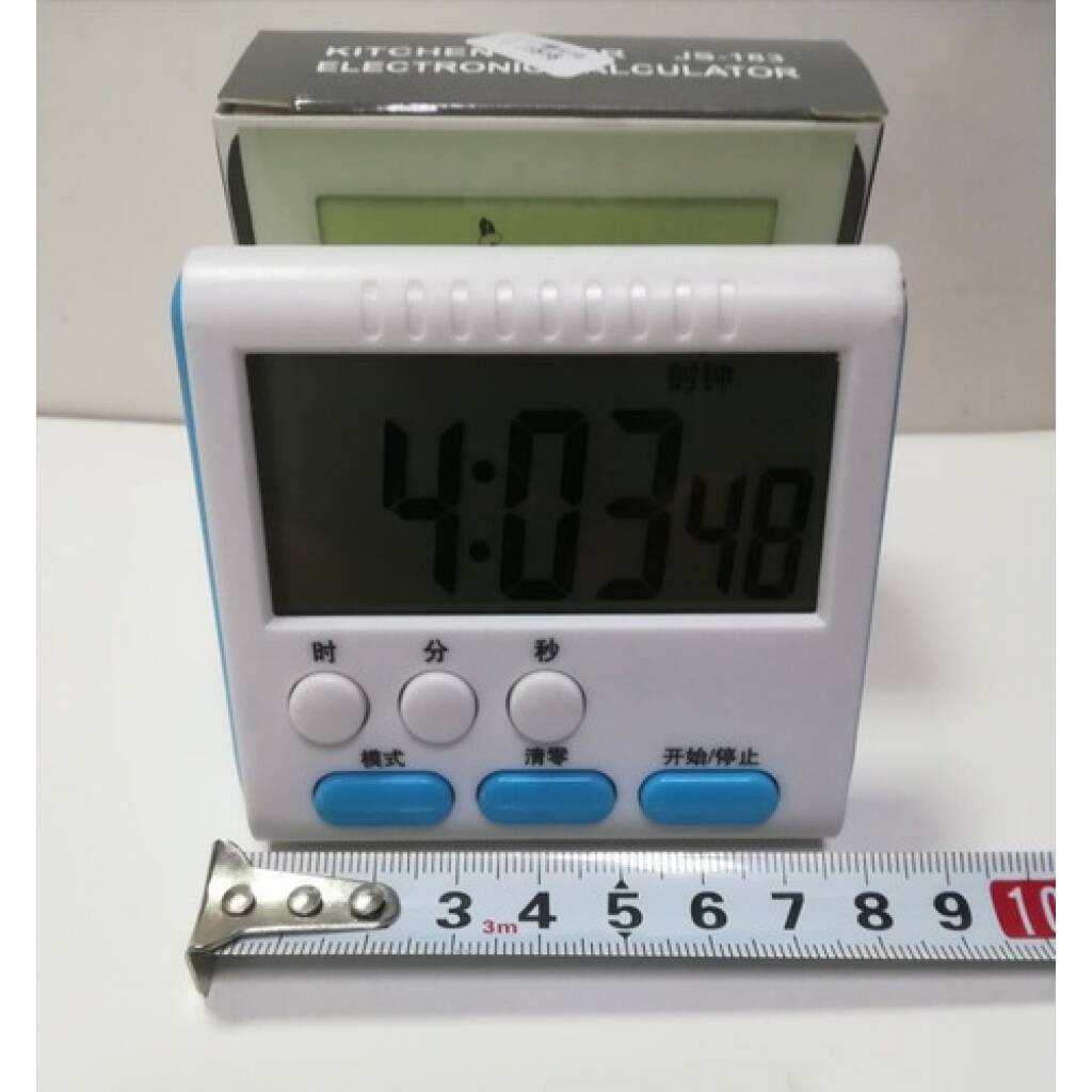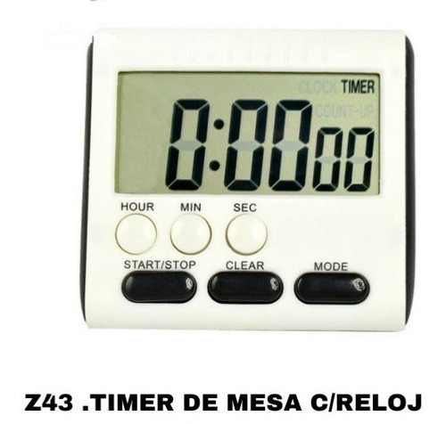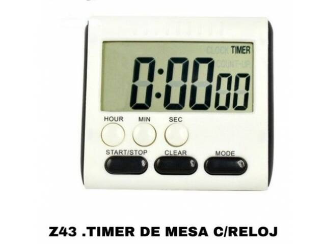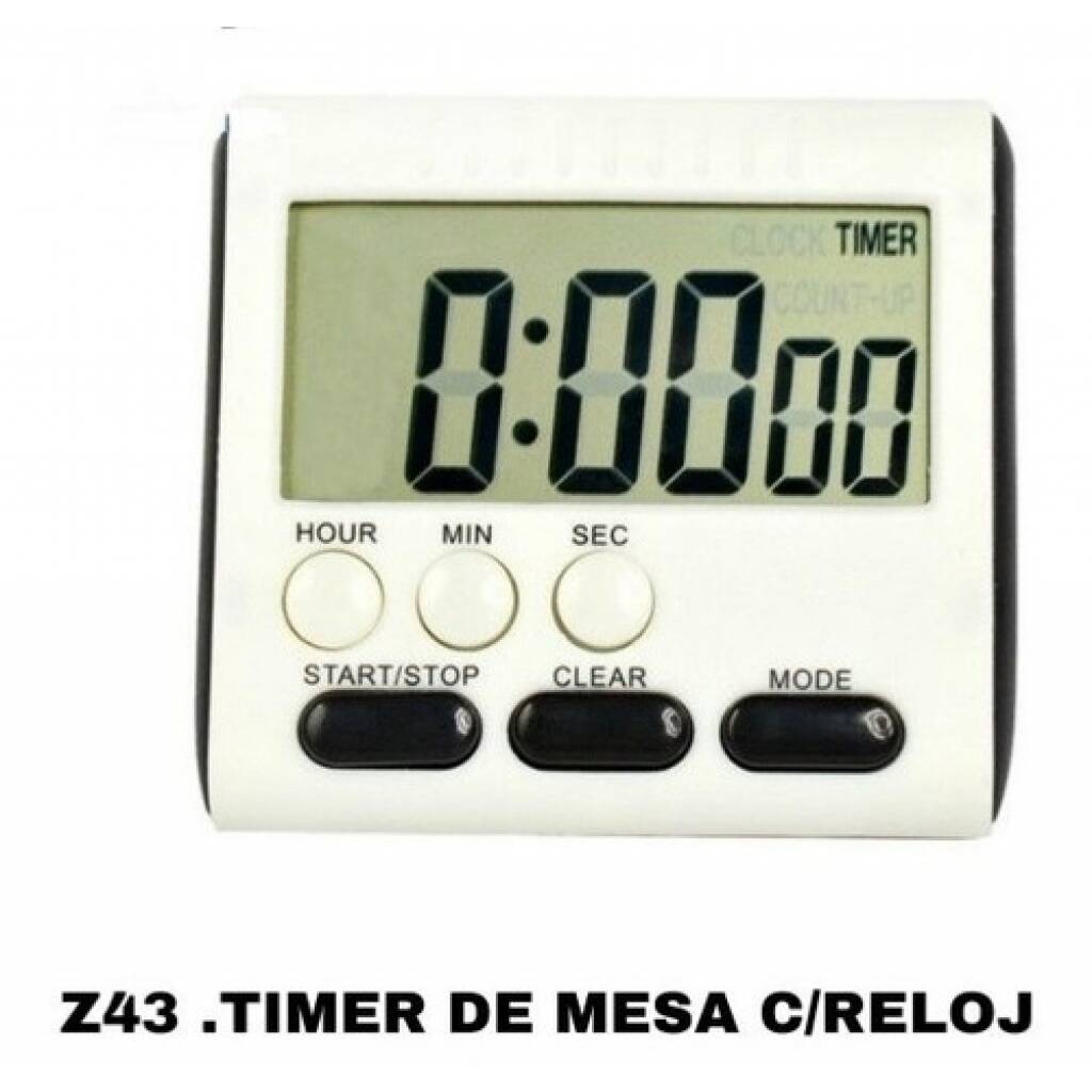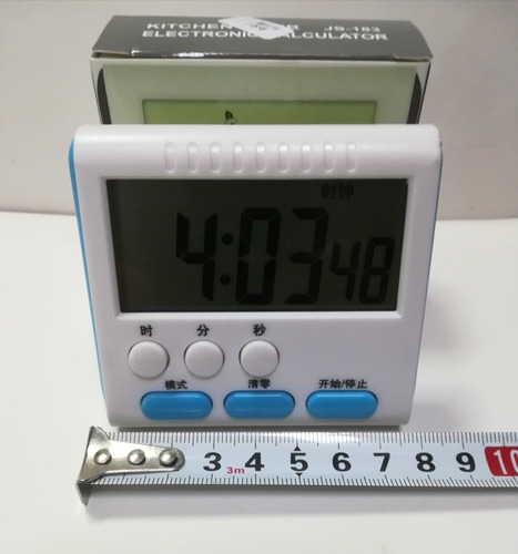 Reloj, cronómetro y timer digital. Seleccionas el tiempo deseado y suena una alarma de aviso. En la parte trasera tiene imán y también una pinza tipo palillo apreta papel. Indispensable en la cocina.