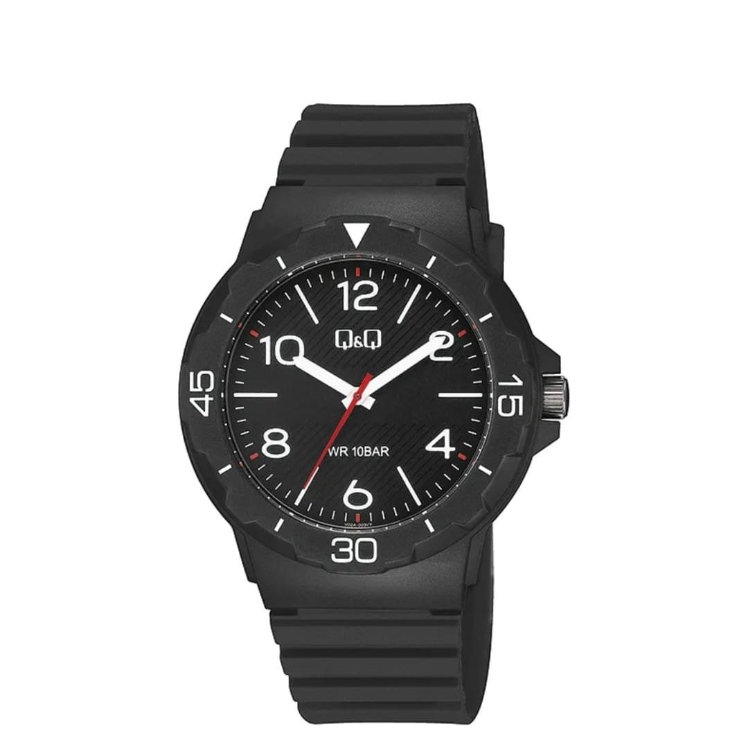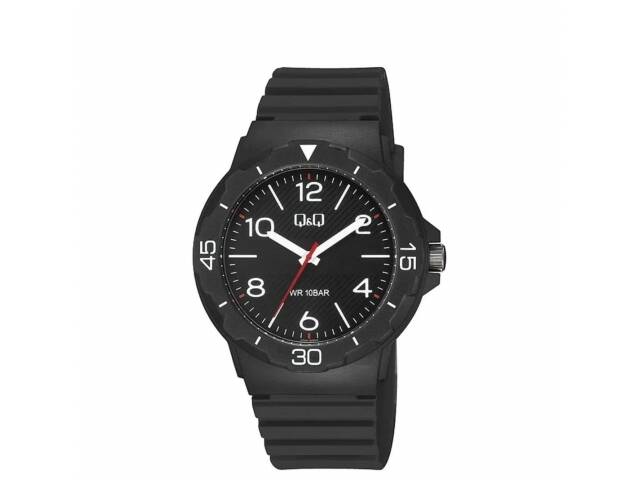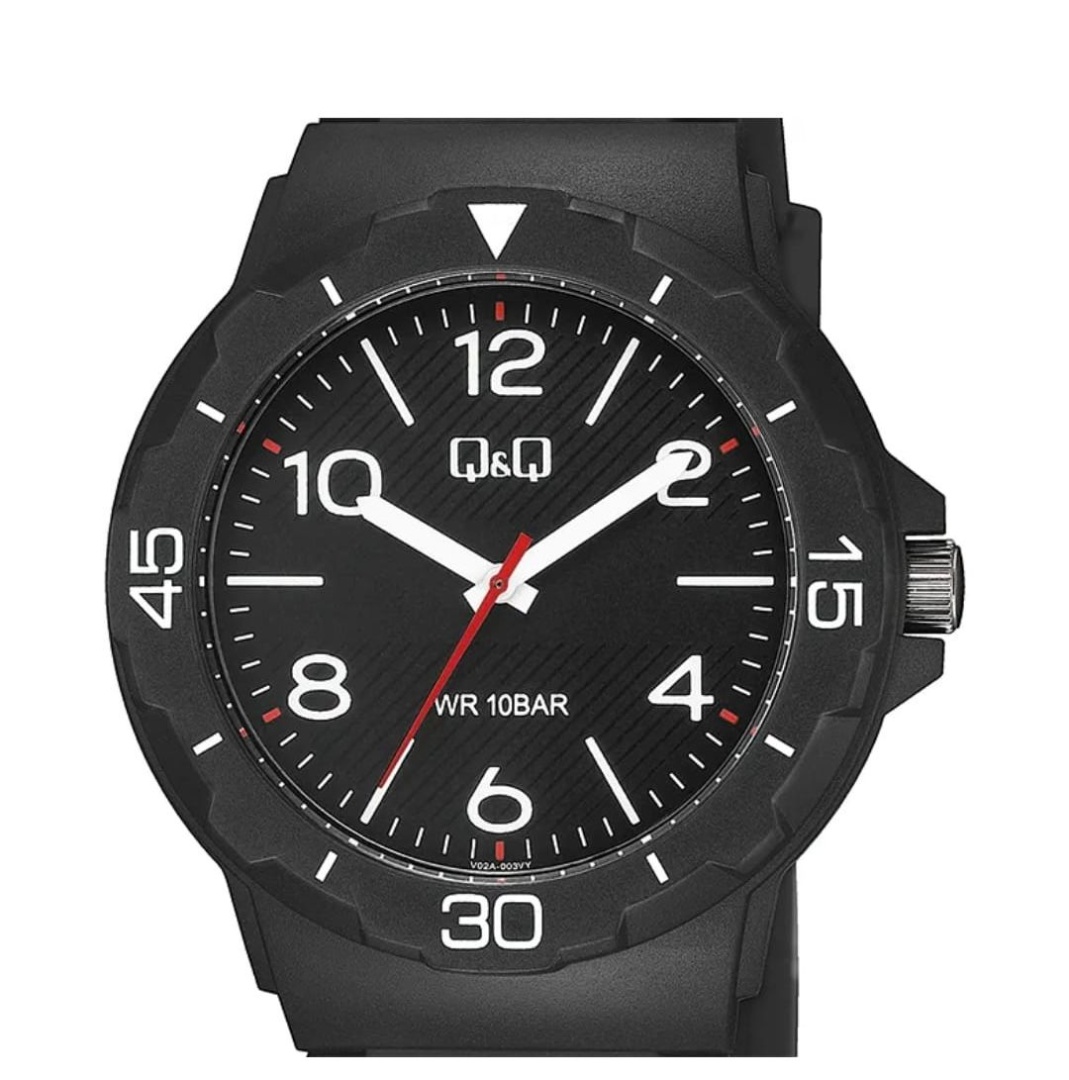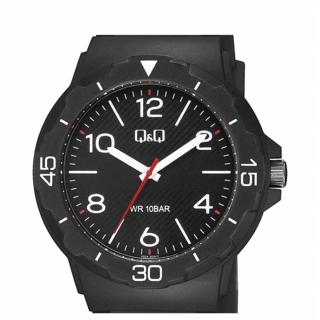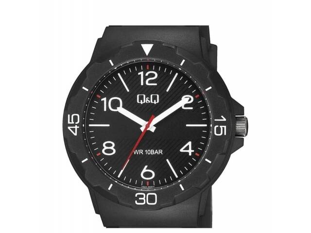 Reloj QyQ PVC negro. V02A003VY. Diametro 43 mm, espesor 10,5 mm. Peso 38 g. QyQ es la marca económica de Citizen. Garantia de la maquina 6 meses y excluye : roturas por accidentes, golpes, mal trato, malla, cristal, caja, pila. Los relojes NO SON SUMERGIBLES. Resistente al agua 10 bar.