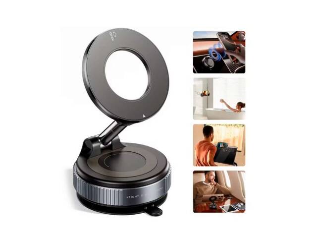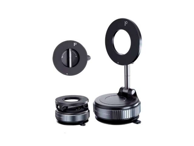 Soporte magnético 360º para celular. Se adapta a cualquier modelo de celular. Colocacion super sencilla mediante ventosa de alta succion. Compatible con Iphone 12 y superiores, fundas MagSafe y dispositivos sin imán gracias al anillo magnetico adhesivo incluido.